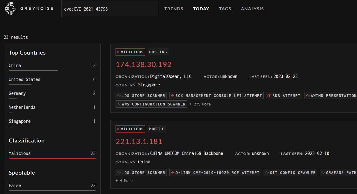 GreyNoise have also flagged 23 hosts that appear to be scanning for or attempting to exploit the vulnerability: