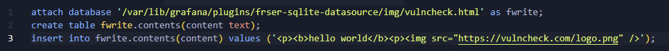 With access to the WebGUI, they were able to load Grafana’s SQLite plugin and write a PoC file to disk with a few lines of SQL:
