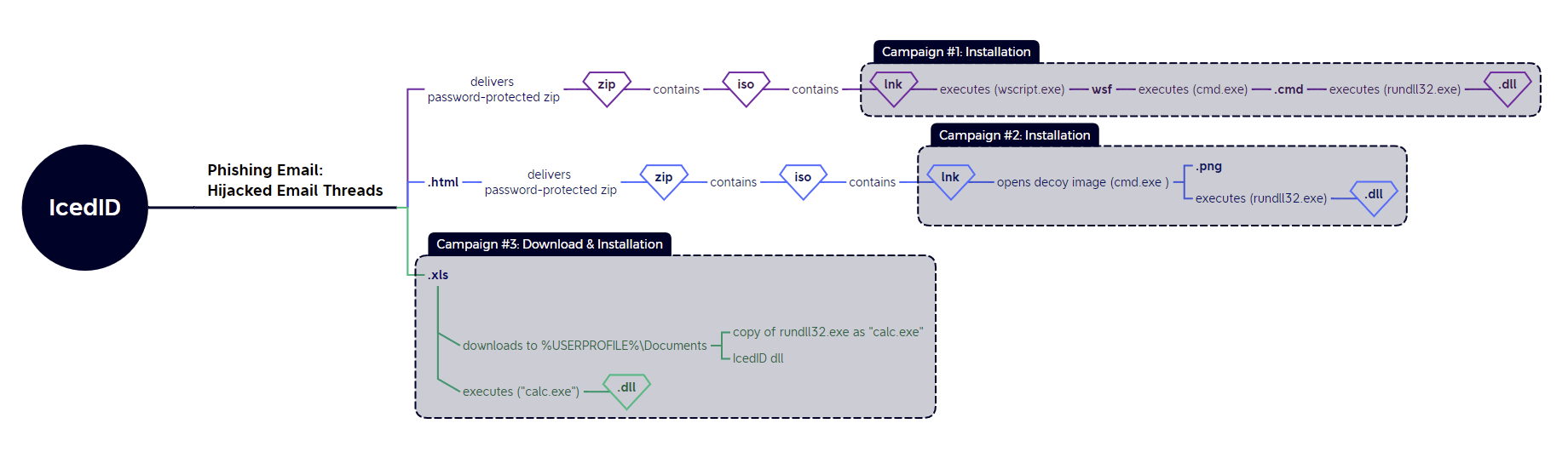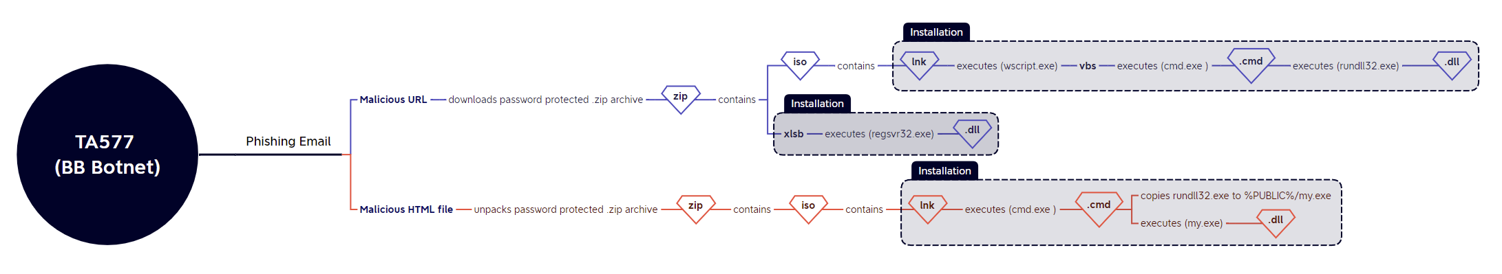 - Password Protected ZIP -> ISO -> LNK -> JS -> [CMD or BAT] -> DLL;