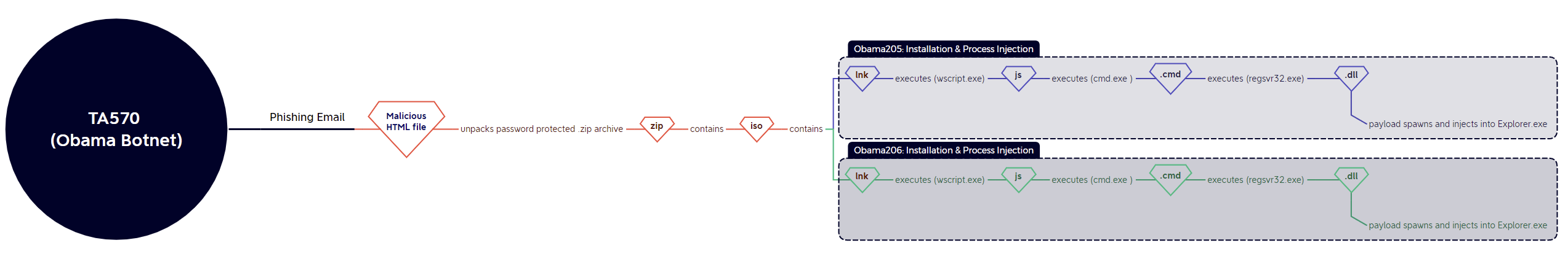 The Obama botnet (TA570) was relatively quiet and used a straightforward execution chain with little/no variance. Similar to TA577, it used .cmd files to obfuscate the dll invocation instead of the .bat files used last week: