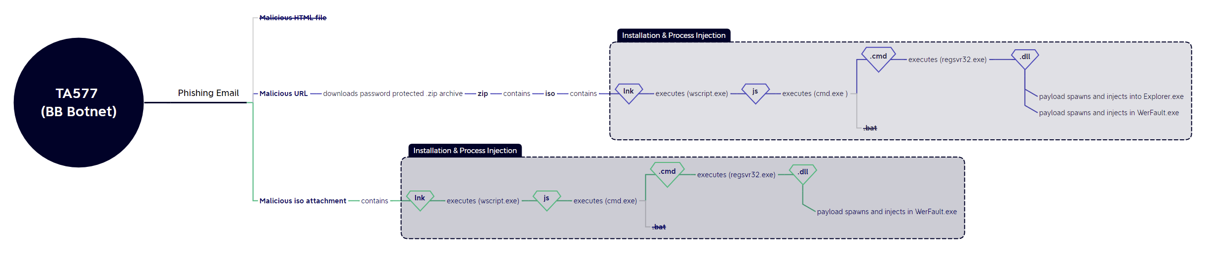 The main change for the BB botnet (TA577) was the use of .cmd files instead of .bat files used last week, and opting for direct iso delivery or malicious urls to deliver their payloads: