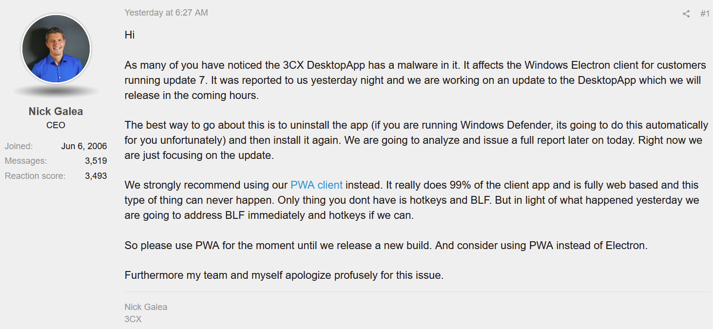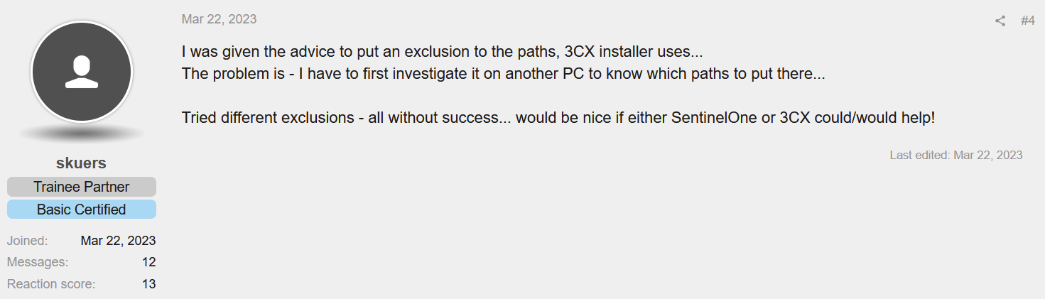 Unfortunately, despite receiving dozens of reports from users of multiple EDR products (SentinelOne, CrowdStrike, ESET, Palo Alto Networks, and SonicWall, to name a few) flagging the VOIP client as malicious, 3CX simply responded by telling customers to add exclusions to allow it to continue to run, and to follow-up with their EDR vendor to resolve the problem.